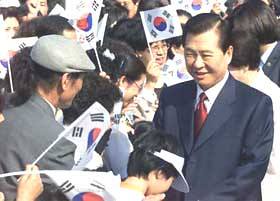 | ROK President Kim Dae-jung is given a hearty send-off in front of the presidential Blue House June 13. Kim is scheduled to meet North Korean leader Kim Jong Il later Tuesday in Pyongyang, the first meeting of leaders from the two sides since they were split more than 50 years ago. |