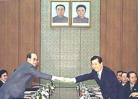 South Korean President Kim Dae-Jung, right, shakes hands with Kim Yong-Nam , president of the North Korean Supreme People's Assembly, during expanded talks in Pyongyang June 14. (
