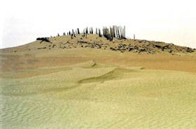 The picture shows the No 5 tomb in Xiaohe cemetery in the Lop Nor Desert with over hundred huge wooden posts standing here as the most prominent symbol. (