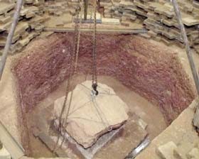 | Archaeologists remove the grand stone that covered the entrance to an underground palace inside the Leifeng Pagoda in Hangzhou, capital of East China's Zhejiang Province, Sunday March 11, 2001. Up to now, a total of eight cultural relics have been unearthed from the palace that had been sealed for the past 1,000 years. |