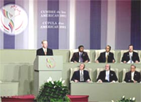 | The Summit of the Americas opened here on Friday evening in a bid to turn the 34- nation Western Hemisphere into the world's largest open market as Canadian police and protesters were clashing just three blocks away. The street violence delayed by more than an hour the opening of the three-day summit, the third of its kind since 1994.(Full Story) |
