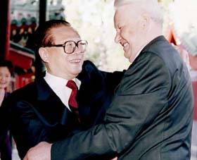 Chinese President Jiang Zemin (L) meets with former Russian President Boris Yeltsin in Beijing, May 28, 2001. (