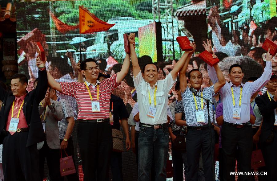 People from Banqiao District of New Taipei and Banqiao Village of Xiamen take part in a communication activity in Banqiao Village of Xiamen, southeast China's Fujian Province, June 15, 2014. The activity of the sixth Straits Forum for promoting friendship between homogeneous villages was held here on Sunday. "Homogeneous villages" refers to the villages share the same names and origins across the Taiwan Straits. (Xinhua/Zhang Guojun)