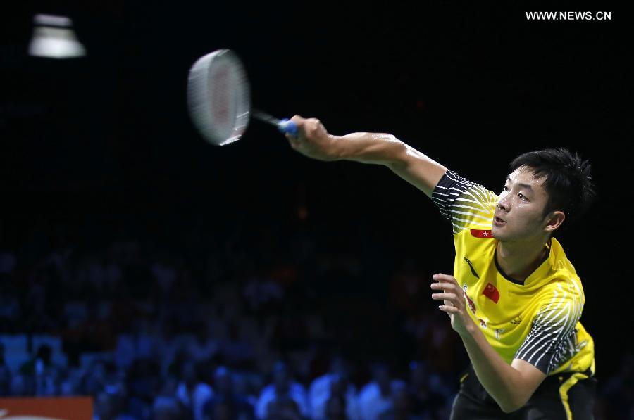 Wang Zhengming of China competes during a men's singles quarterfinal match against Chong Wei Lee of Malaysia on Day 5 of Li Ning BWF World Championships 2014 at Ballerup Super Arena in Copenhagen, Denmark, on Aug. 29, 2014. Wang Zhengming lost 0-2. (Xinhua/Wang Lili)