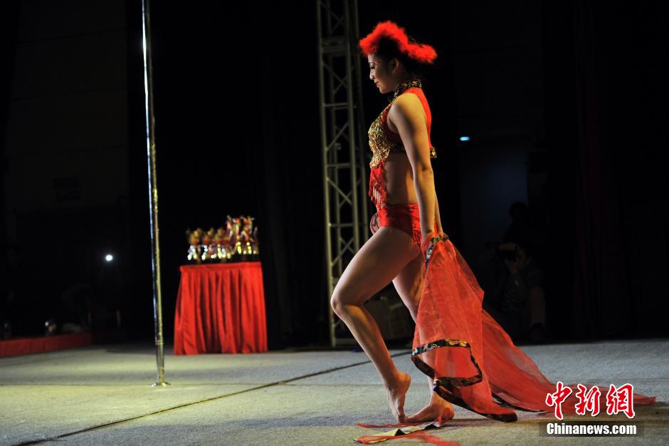 The 8th World Pole Dance Championship was held in Beijing Fenglan International Theater, Oct. 29, 2014. Contestants from China, Russia, Canada, Australia, Malaysia, South Korea, Japan, and Hong Kong participated in the contest. Ms. Symone, an international level pole dancing judge and a professional pole dancer, was the main judge for the championship. (Chinanews/Jin Shuo)