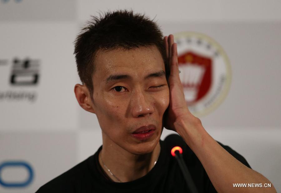 Malaysia's Lee Chong Wei attends the press conference after his preliminary match against India's Srikanth Nammalwar Kidambi at the 2015 Sudirman Cup BWF World Mixed Team Championships in Dongguan, east China's Guangdong Province, May 11, 2015. (Xinhua/Meng Yongmin)