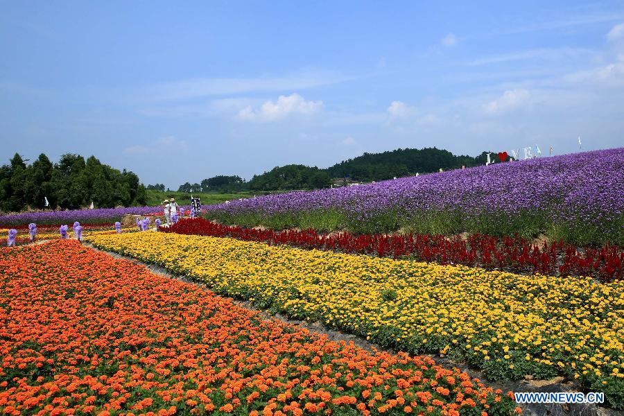 | People visit a lavender garden in Fenghuang County, Xiangxi Tujia-Miao Autonomous Prefecture, central China's Hunan Province, July 20, 2015. (Xinhua/Peng Biao) |