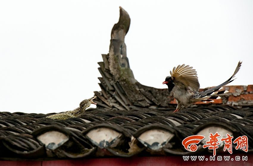 A couple of blue magpies endeavour to battle with a snake on roof in NW China's Shaanxi (Photo/HSW)