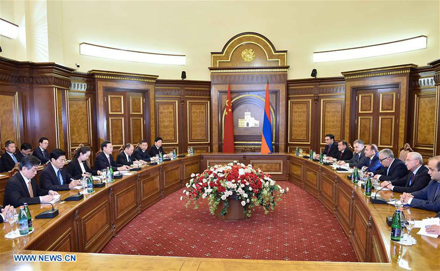 Chinese Vice Premier Zhang Gaoli (4th L, front) holds talks with Armenian Prime Minister Hovik Abrahamyan (4th R) in Yerevan, Armenia, June 6, 2016. [Photo: Xinhua]