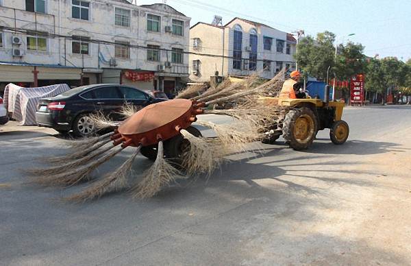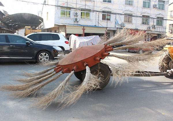 The sweeper consists of a motor-driven rotary plate attached to 16 brooms. By dragging the machine behind a tractor, sanitation workers have been able to dramatically improve their work efficiency.