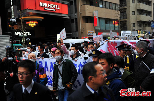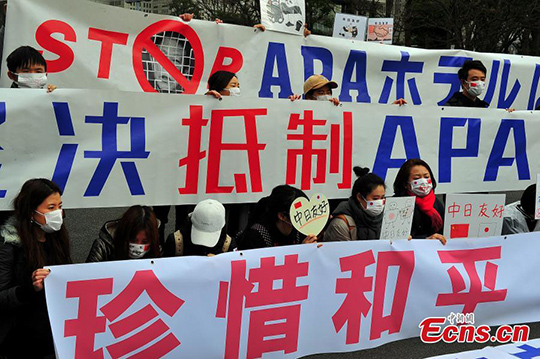 More than 300 Chinese in Japan staged a protest in Tokyo on Sunday against the APA chain of hotels, which placed books in hotel rooms that openly deny the Nanjing Massacre and the existence of "comfort women," while a group of right-wing activists interfered.