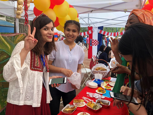 Visitors enjoy Macedonian food at the 15th World Cultural Festival of Beijing Language and Culture University on May 20, 2018. (Photo: Du Mingming/People's Daily)