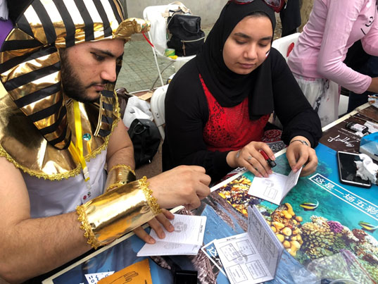 Students get their cultural festival “passports” stamped at the Egyptian booth at the 15th World Cultural Festival of Beijing Language and Culture University on May 20, 2018. (Photo: Du Mingming/People's Daily)