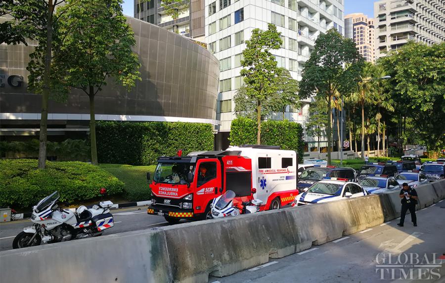 Police and emergency vehicles sit outside the St. Regis Hotel on Sunday where DPRK leader Kim Jong-un is staying. (Photo: Yang Sheng/GT)