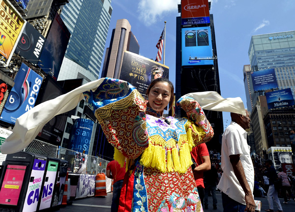 An artist promotes Peking Opera at Times Square in New York City. China's national image in the international community has continued to improve in recent years, according to a report released in Beijing on Sept 15. WANG LEI/XINHUA