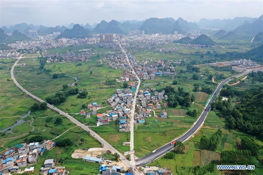 Aerial photo taken on Sept. 16, 2020 shows roads winding through the mountains in Dongmen Township of Luocheng Mulao Autonomous County, south China's Guangxi Zhuang Autonomous Region. In recent years, local government has increased investment in the construction of transportation infrastructure to help local people shake off poverty. (Xinhua/Lu Boan)