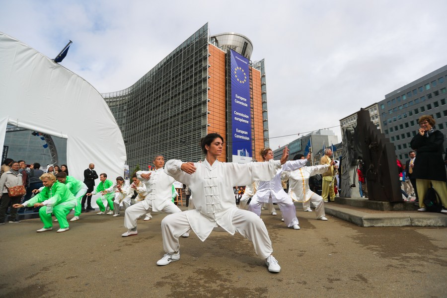 People perform Qigong in front of the European Commission headquarters during the China-EU Sports Day in Brussels, Belgium, Spet. 25, 2019. (Xinhua/Zheng Huansong)