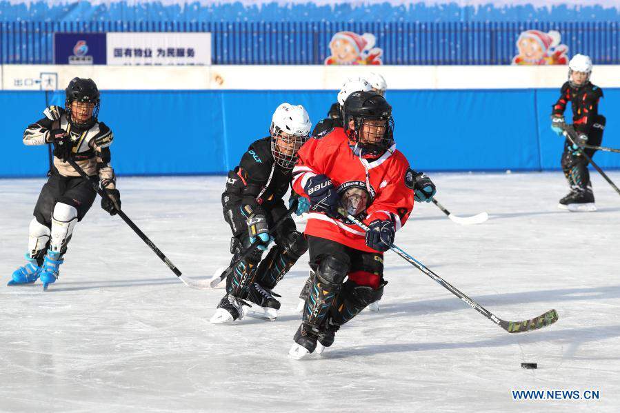 Ice hockey lovers take part in training at a rink in Zhangjiakou economic development zone in Zhangjiakou, north China's Hebei Province, Dec. 12, 2020. In recent years, Zhangjiakou has acted to promote ice-snow sports, upgrade its ice-snow sports facilities and strengthen ice-snow industries, in a bid to attract more and more people to join various ice-snow sports. (Photo by Wu Diansen/Xinhua)