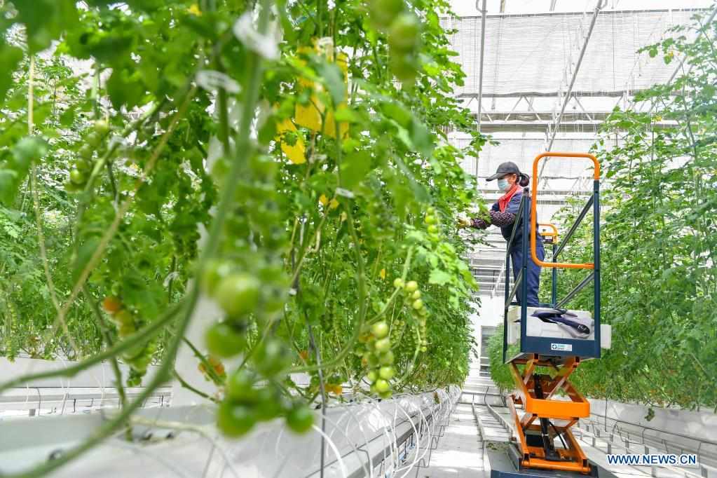 A staff member checks plants at a green house in Yongji County of Jilin City, northeast China's Jilin Province, April 14, 2021. This green house in Yongji County covering an area of 32,000 square meters has been cultivating vegetables and fruits here through soilless culture, automatic intelligent control to make sure various crops being produced all year round. In 2020, the green house produced 600 tons of fruits and vegetables, with an output value of more than 12 million yuan (about 1.84 million dollars). (Xinhua/Zhang Nan)