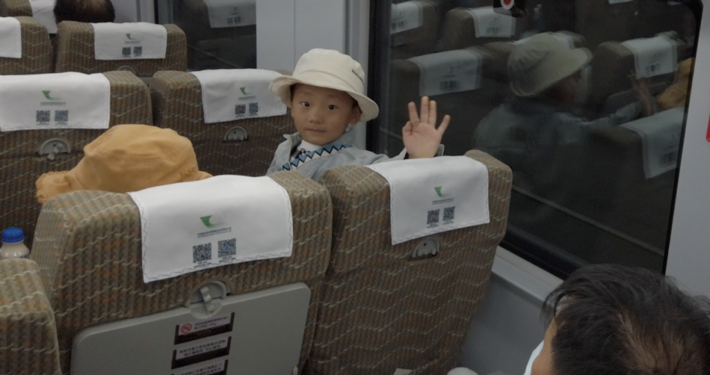 A 6-year-old child who is on his first train trip waves to the camera of People’s Daily on a high-speed train from Nyingchi to Lhasa, both cities of southwest China’s Tibet autonomous region. (People’s Daily/ Zhang Xiaodong)