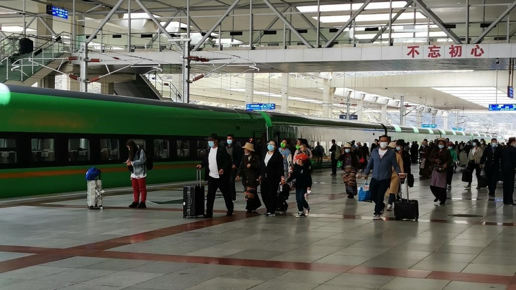 Many passengers disembarked at Xierong railway station in Lhasa, an interchange station between the Lhasa-Nyingchi Railway and the Lhasa-Shigatse Railway, when the high-speed train No. 8982 arrived at the end station of their journeys. At the same time, more passengers boarded the train at the station, which will take them to Shigatse city along the Lhasa-Shigatse Railway.