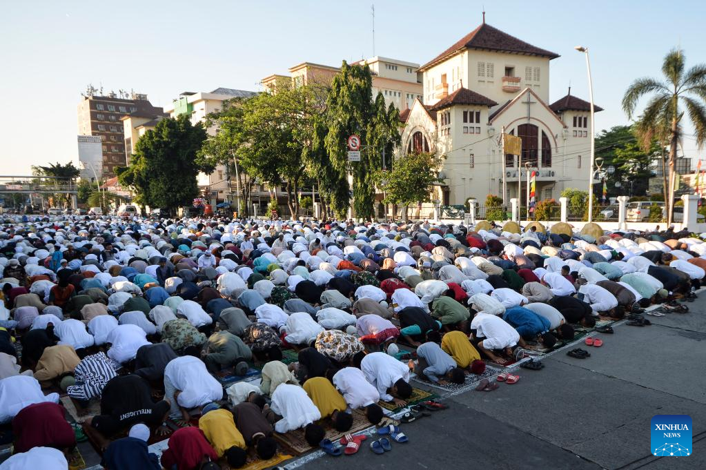 Indonesian muslim people gather on a road to perform Eid al-Adha prayers in Jakarta, Indonesia, on July 10, 2022. (Photo by Veri Sanovri/Xinhua)