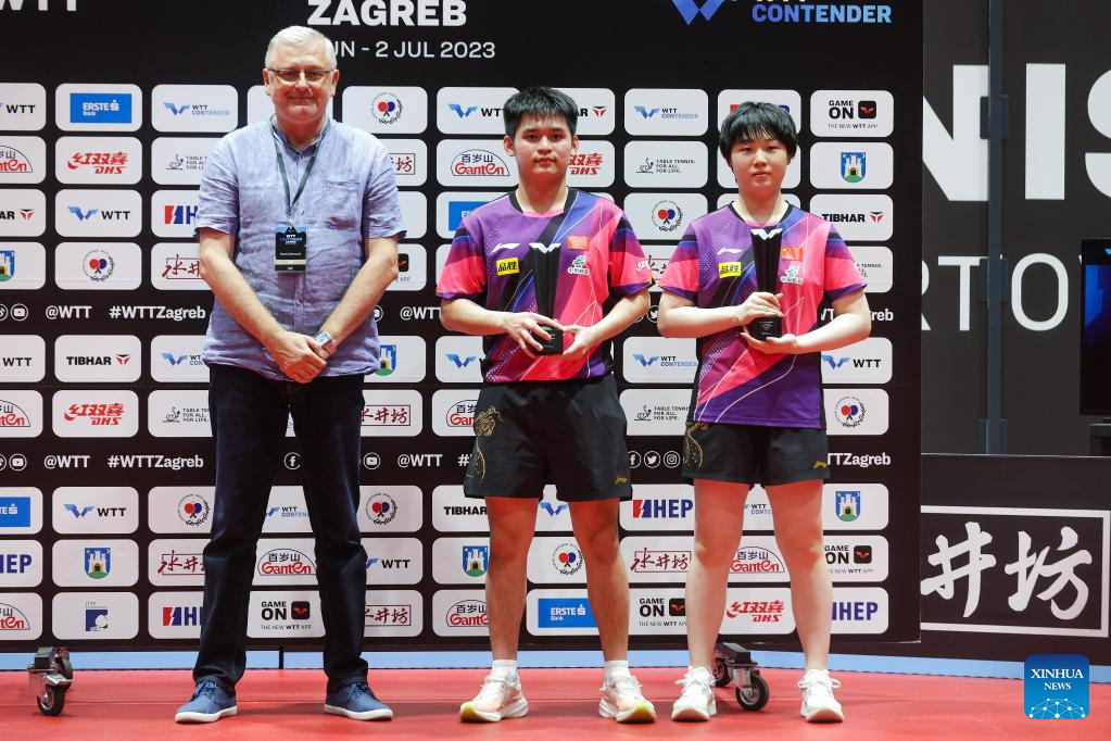 Winners Wang Chuqin (R)/Sun Yingsha (C) of China pose with their trophies after winning mixed doubles final match against Kuai Man/Lin Shidong of China at the 2023 World Table Tennis (WTT) Contender Zagreb in Zagreb, Croatia, on July 1, 2023. (Photo by Luka Stanzl/PIXSELL via Xinhua)