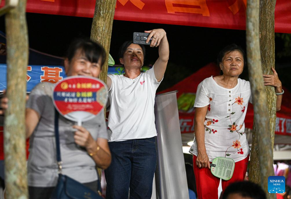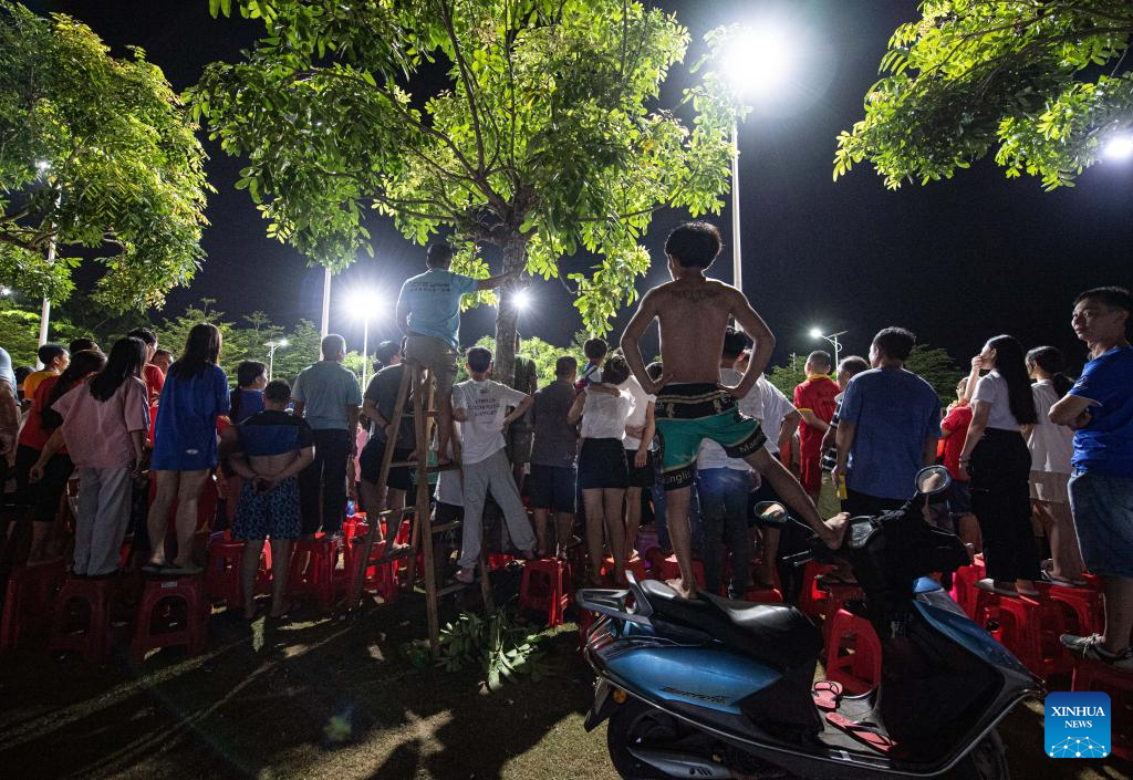 People watch a village volleyball match on a screen in Wenchang, south China's Hainan Province, July 29, 2023. (Xinhua/Pu Xiaoxu)