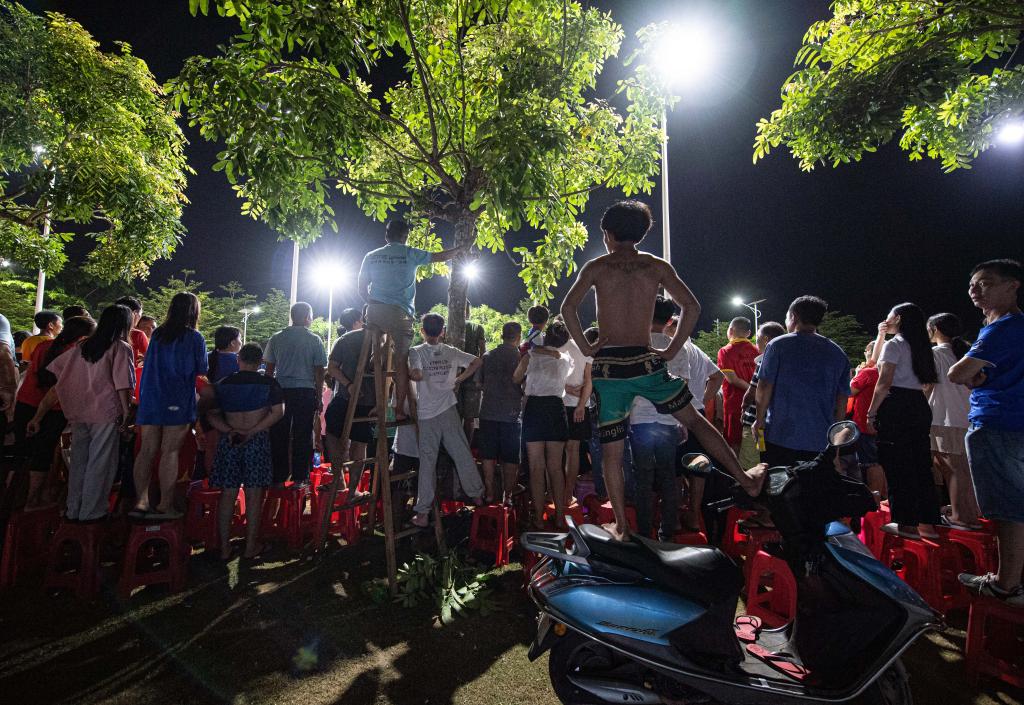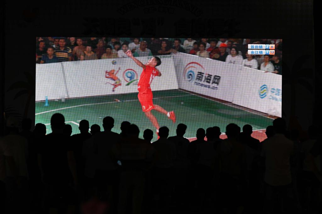 People watch a village volleyball match on a screen in Wenchang, south China's Hainan Province, July 29, 2023. (Xinhua/Pu Xiaoxu)