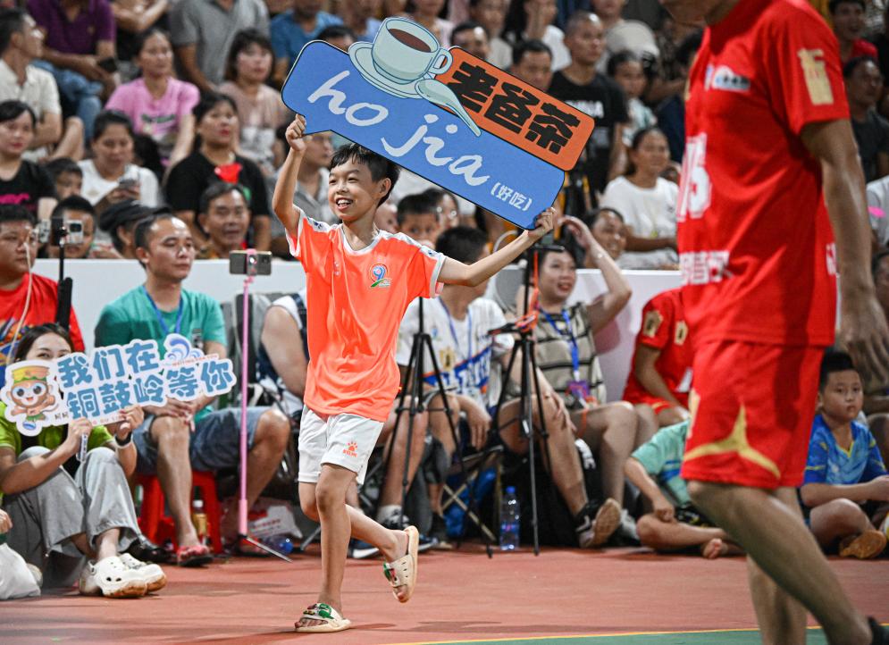 A boy cheers for his team during a village volleyball match in Wenchang, south China's Hainan Province, Aug. 13, 2023. (Xinhua/Pu Xiaoxu)