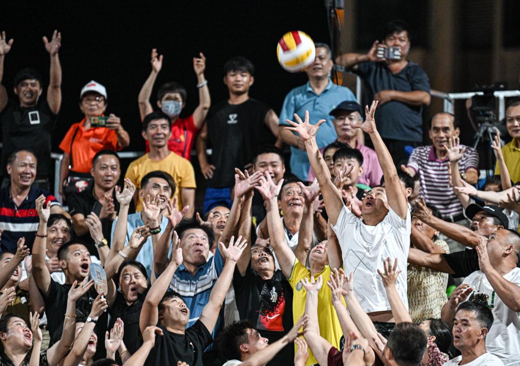 Spectators try to catch a volleyball before a village volleyball match in Wenchang, south China's Hainan Province, Aug. 13, 2023. (Xinhua/Pu Xiaoxu)