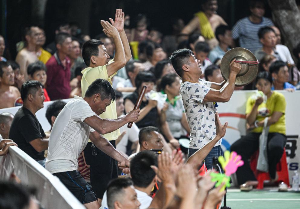 Spectators cheer for players during a village volleyball match in Wenchang, south China's Hainan Province, July 15, 2023. (Xinhua/Pu Xiaoxu)