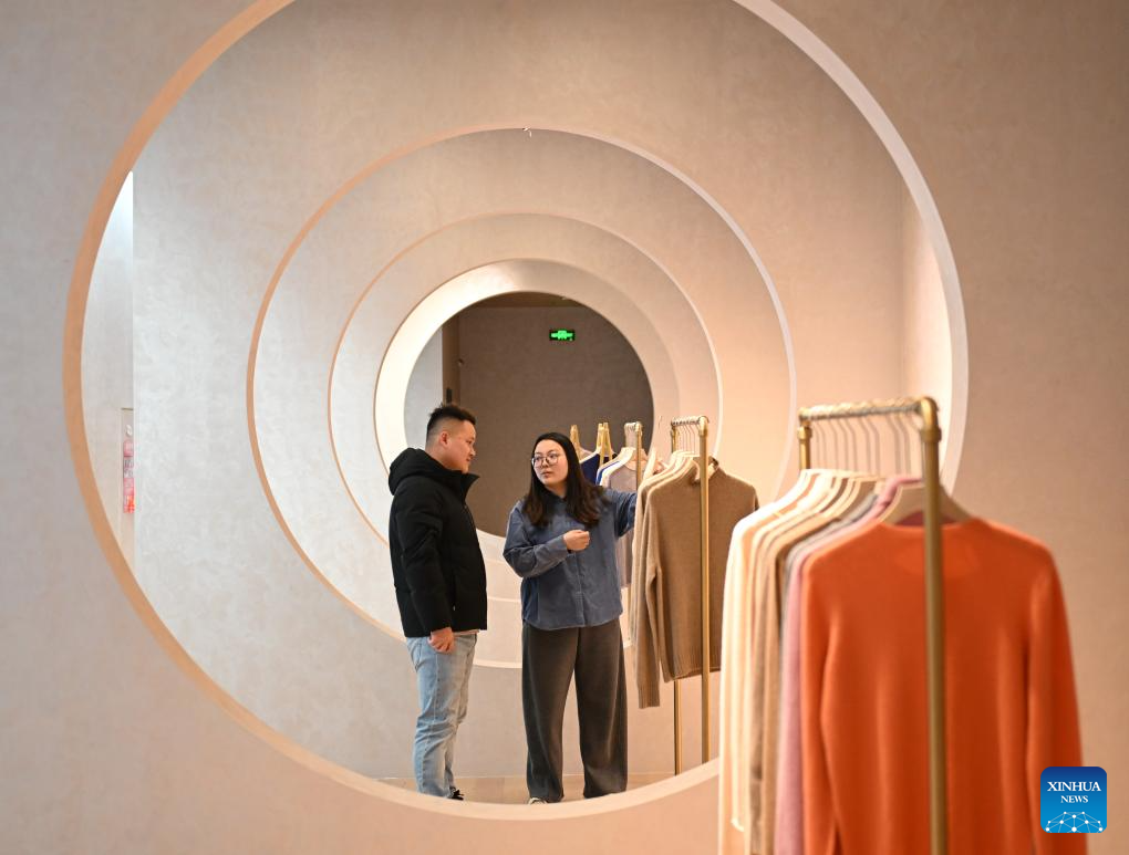 A staff member introduces cashmere sweaters to a customer at the exhibition hall of a cashmere products manufacturer in Qinghe County, Xingtai City, north China's Hebei Province, Jan. 18, 2025. Cashmere products manufacturers in Qinghe County are busy with production for orders before the upcoming Spring Festival holidays. Qinghe County is a renowned cashmere raw material processing and distribution center, cashmere spinning base and an important production and marketing base of cashmere products in China. (Xinhua/Mu Yu)