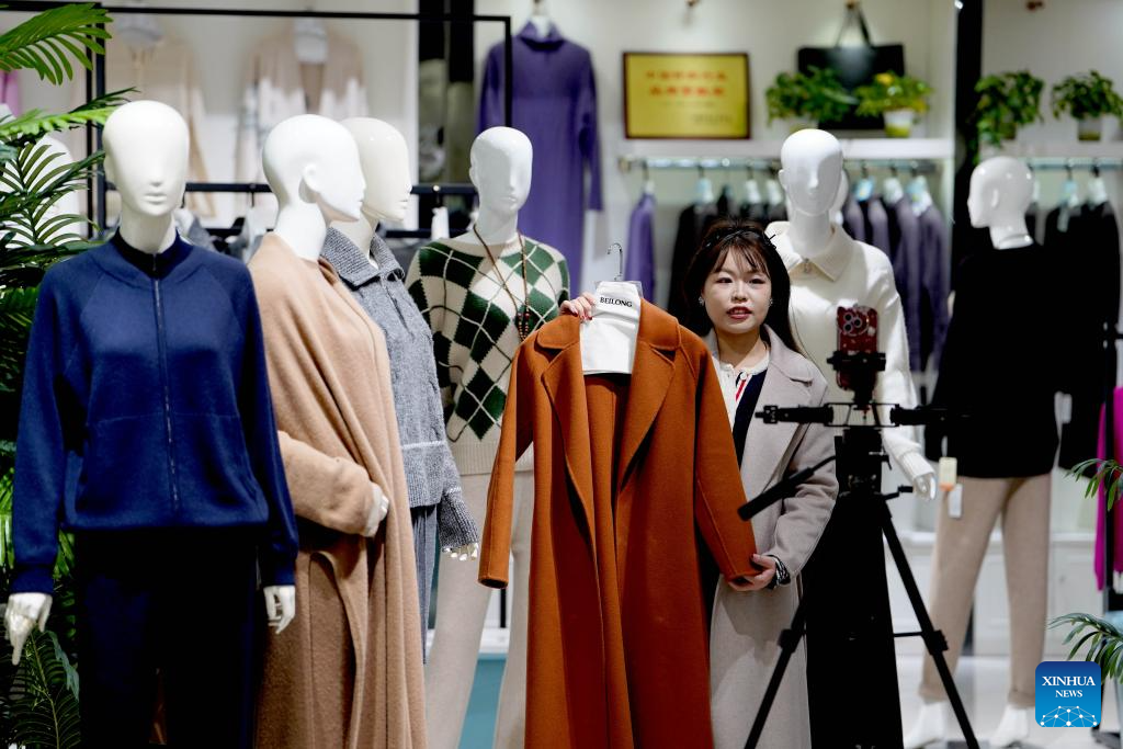 A staff member sells cashmere clothes via live-streaming at a store in Qinghe County, Xingtai City, north China's Hebei Province, Jan. 18, 2025. Cashmere products manufacturers in Qinghe County are busy with production for orders before the upcoming Spring Festival holidays. Qinghe County is a renowned cashmere raw material processing and distribution center, cashmere spinning base and an important production and marketing base of cashmere products in China. (Xinhua/Mu Yu)