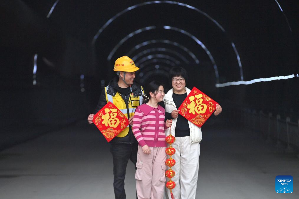 Workers and their family members are pictured at the construction site of an expressway linking Yufeng and Yizhou of south China's Guangxi Zhuang Autonomous Region in Liuzhou of Guangxi, Jan. 22, 2025.