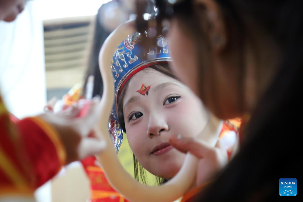 A Yingge dance team member prepares for performance at a training base in Shantou, south China's Guangdong Province, Jan. 29, 2025. (Photo by Yao Jun/Xinhua)