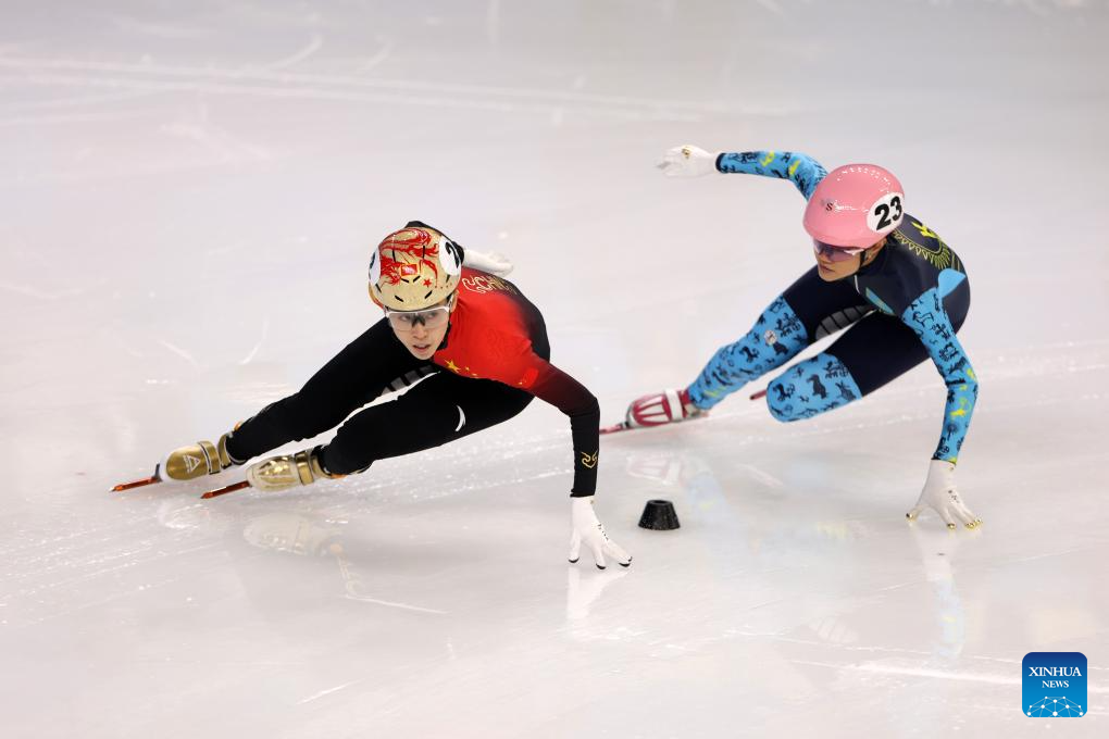 Fan Kexin (C) of China competes during the mixed 2000m relay semifinal match of the short track speed skating event at the 9th Asian Winter Games in Harbin, northeast China's Heilongjiang Province, Feb. 7, 2025. (Xinhua/Sun Fei)