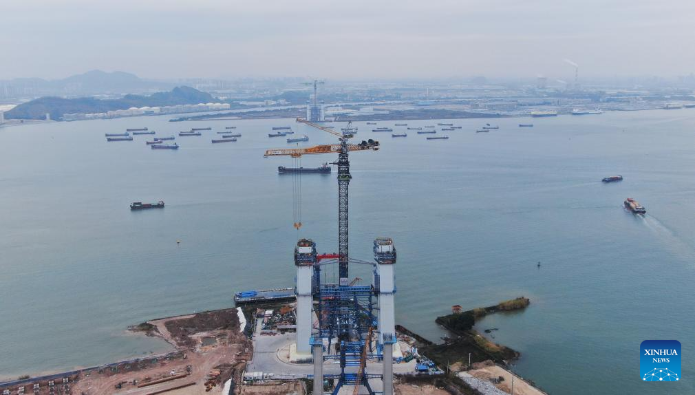 Staff members work at the construction site of the Shiziyang grand bridge, a major project of the Shiziyang Channel in south China's Guangdong Province, Feb. 7, 2025. The Shiziyang Channel is another mega infrastructure project after the Hong Kong-Zhuhai-Macao Bridge and the Shenzhen-Zhongshan Link in south China's Guangdong-Hong Kong-Macao Greater Bay Area. Its major project, the Shiziyang grand bridge, has a main span of 2,180 meters. Upon completion, it will play an important role in the development of the Pearl River Estuary area. (Xinhua/Wang Ruiping)