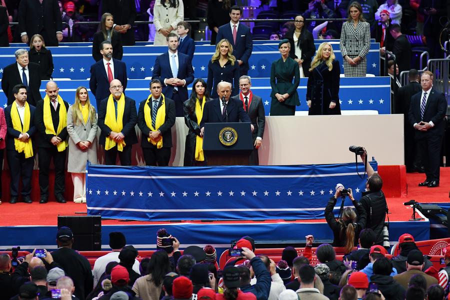 U.S. President Donald Trump (C, front) delivers a speech at Capital One arena in Washington, D.C., the United States, on Jan. 20, 2025. (Xinhua/Li Rui)