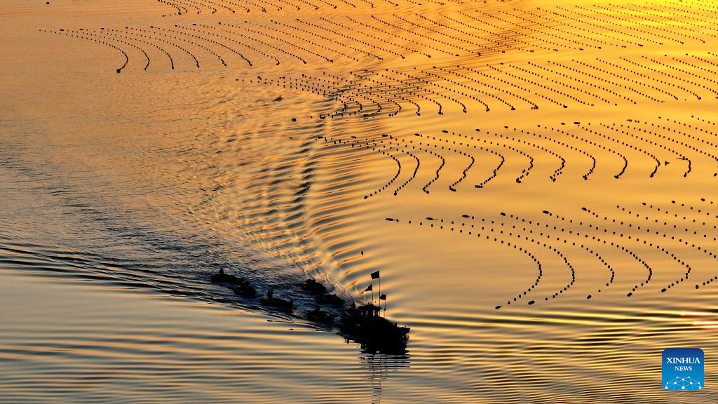 An aerial drone photo taken on Feb. 11, 2025 shows fishermen working at the kelp breeding area in Rongcheng City, east China's Shandong Province. (Photo by Yang Zhili/Xinhua)