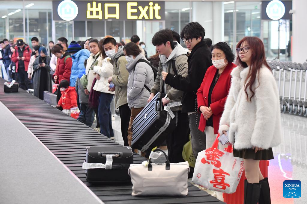Passengers collect their luggage at the Terminal 5 of Xianyang International Airport in Xi'an, capital of northwest China's Shaanxi Province, Feb. 20, 2025. The Terminal 5 of the Xianyang International Airport was officially put into operation on Thursday. Covering an area of 705,500 square meters, which is bigger than the total areas of the T1, T2 and T3 terminals, Terminal 5 allows the same floor departure of domestic and international passengers. It also sets up a museum to display cultural relics unearthed in Shaanxi. (Xinhua/Shao Rui)