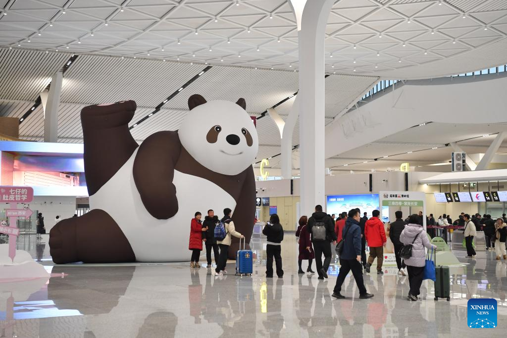 People stop to watch a sculpture of giant panda "Qizai" at the departure hall of Terminal 5 of Xianyang International Airport in Xi'an, capital of northwest China's Shaanxi Province, Feb. 20, 2025. The Terminal 5 of the Xianyang International Airport was officially put into operation on Thursday. Covering an area of 705,500 square meters, which is bigger than the total areas of the T1, T2 and T3 terminals, Terminal 5 allows the same floor departure of domestic and international passengers. It also sets up a museum to display cultural relics unearthed in Shaanxi. (Xinhua/Shao Rui)