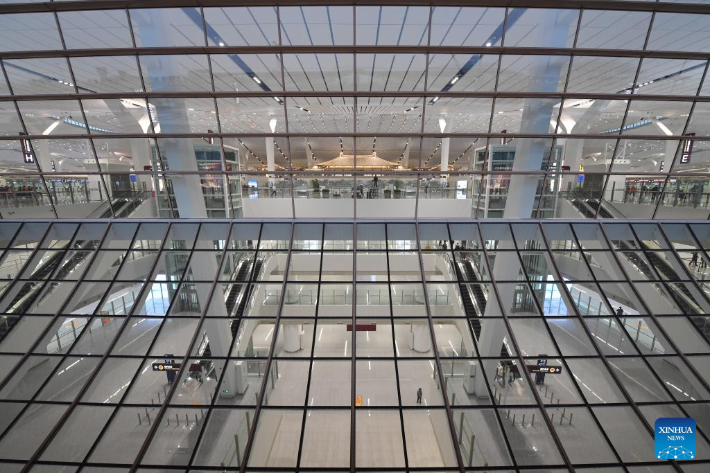 The Terminal 5 of Xianyang International Airport is seen in Xi'an, capital of northwest China's Shaanxi Province, Feb. 20, 2025. The Terminal 5 of the Xianyang International Airport was officially put into operation on Thursday. Covering an area of 705,500 square meters, which is bigger than the total areas of the T1, T2 and T3 terminals, Terminal 5 allows the same floor departure of domestic and international passengers. It also sets up a museum to display cultural relics unearthed in Shaanxi. (Xinhua/Shao Rui)