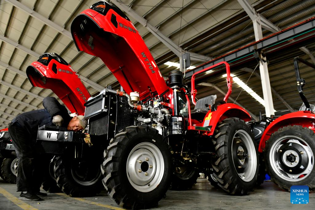 A staff member assembles a tractor in Rizhao Liying Machinery Manufacturing Co., Ltd. in Rizhao, east China's Shandong Province, Feb. 22, 2025. In recent years, local authorities in Rizhao have made efforts to assist traditional advantageous industries in innovating and develop an array of emerging and future-oriented industries. (Xinhua/Guo Xulei)