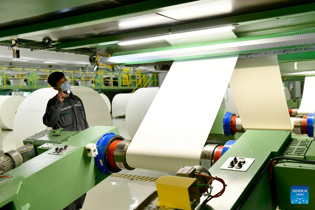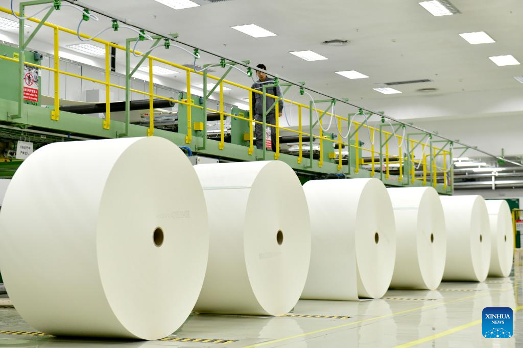 A staff member works at a production line of Asia Symbol (Shandong) Pulp and Paper Co., Ltd. in Rizhao, east China's Shandong Province, Feb. 22, 2025. In recent years, local authorities in Rizhao have made efforts to assist traditional advantageous industries in innovating and develop an array of emerging and future-oriented industries. (Xinhua/Guo Xulei)