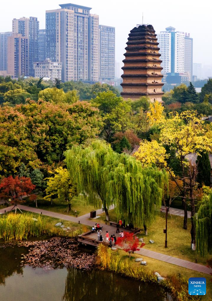 A drone photo shows the Small Wild Goose Pagoda in Xi'an, northwest China's Shaanxi Province, Nov. 10, 2024. As the provincial capital of northwest China's Shaanxi Province, Xi'an, with a history of over 3,100 years, has served as the capital city for 13 dynasties of China. Under the policies of protection and utilization of cultural relics, the historical and cultural resources of Xi'an have been well preserved. (Xinhua/Zou Jingyi)