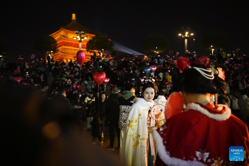 A tourist wearing traditional costumes poses for photos at the Bell Tower in Xi'an, northwest China's Shaanxi Province, Dec. 31, 2024. As the provincial capital of northwest China's Shaanxi Province, Xi'an, with a history of over 3,100 years, has served as the capital city for 13 dynasties of China. Under the policies of protection and utilization of cultural relics, the historical and cultural resources of Xi'an have been well preserved. (Xinhua/Zou Jingyi)