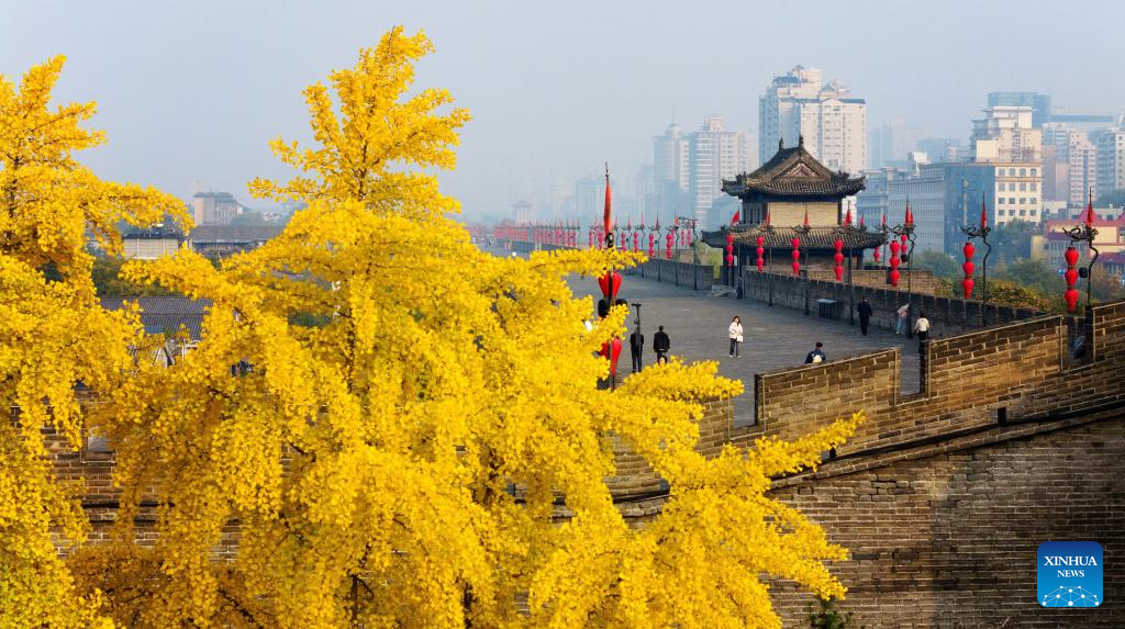 A drone photo shows tourists walking on the City Wall of Xi'an, northwest China's Shaanxi Province, Nov. 6, 2024. As the provincial capital of northwest China's Shaanxi Province, Xi'an, with a history of over 3,100 years, has served as the capital city for 13 dynasties of China. Under the policies of protection and utilization of cultural relics, the historical and cultural resources of Xi'an have been well preserved. (Xinhua/Zou Jingyi)