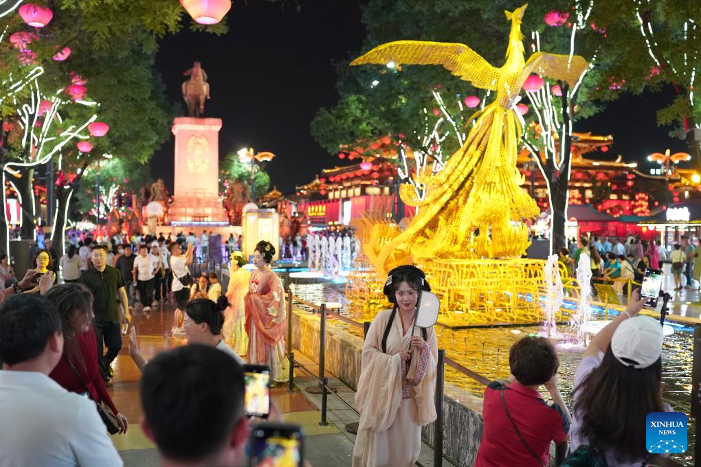 Tourists visit the Grand Tang Mall in Xi'an, northwest China's Shaanxi Province, May 20, 2024. As the provincial capital of northwest China's Shaanxi Province, Xi'an, with a history of over 3,100 years, has served as the capital city for 13 dynasties of China. Under the policies of protection and utilization of cultural relics, the historical and cultural resources of Xi'an have been well preserved. (Xinhua/Shao Rui)
