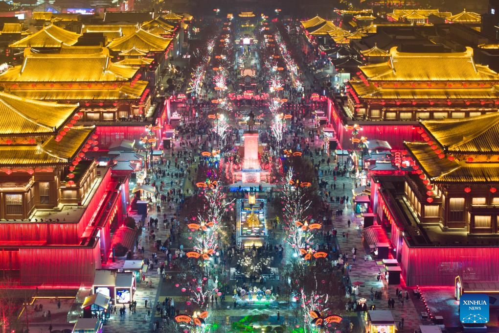 An aerial drone photo shows tourists visiting the Grand Tang Mall in Xi'an, northwest China's Shaanxi Province, Feb. 2, 2024. As the provincial capital of northwest China's Shaanxi Province, Xi'an, with a history of over 3,100 years, has served as the capital city for 13 dynasties of China. Under the policies of protection and utilization of cultural relics, the historical and cultural resources of Xi'an have been well preserved. (Xinhua/Shao Rui)